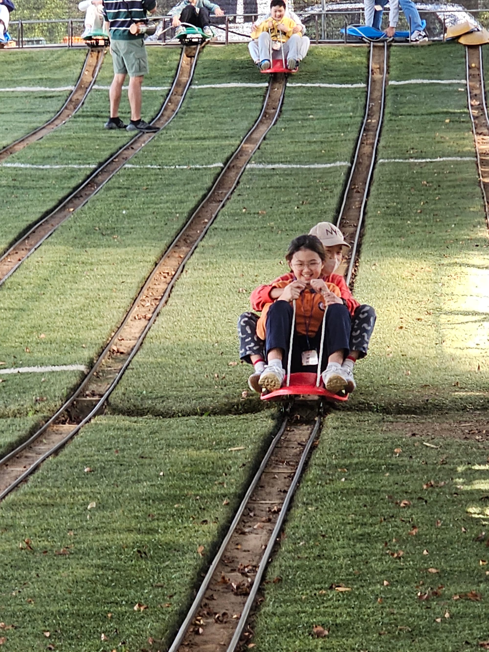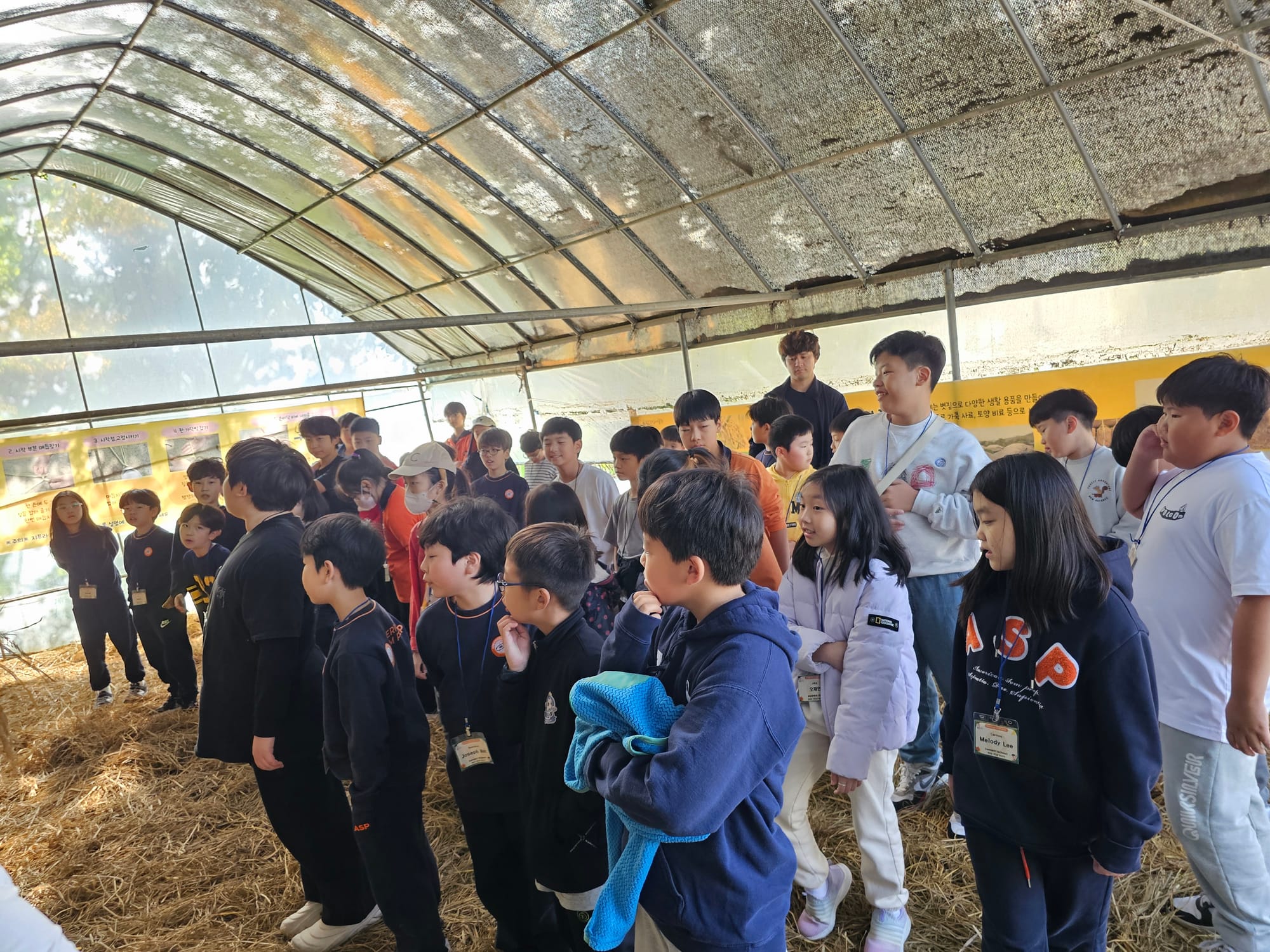 The elementary school students were guided on a tour to learn about plants and rice. During the tour, they planted a plant, milled rice, and fed animals at mini-farms. For the final activity, they had a chance to ride sleds. In the picture, you can see that students enjoyed riding sleds.